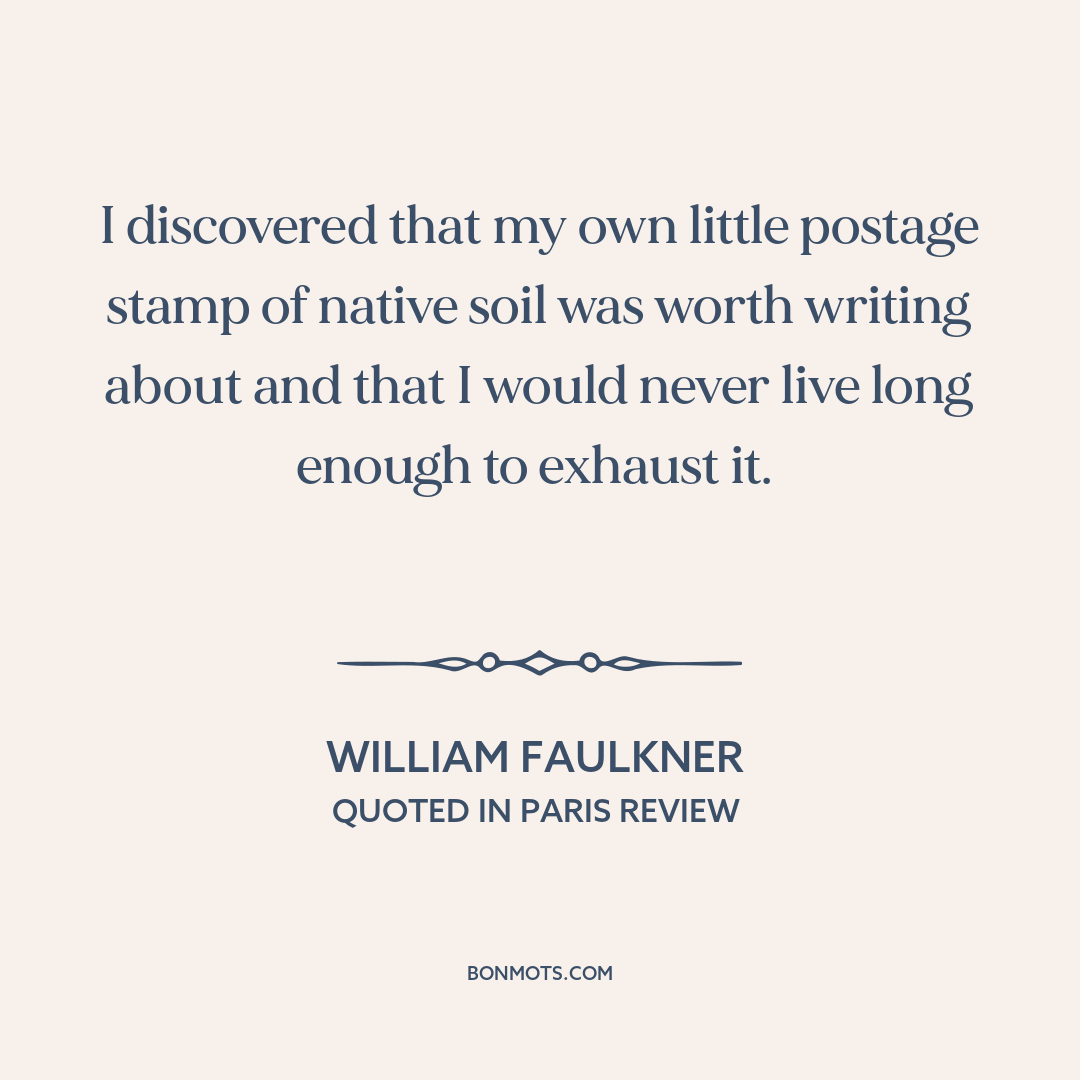 I discovered that my own little postage stamp of native soil was worth writing about and that I would never live long enough to exhaust it.