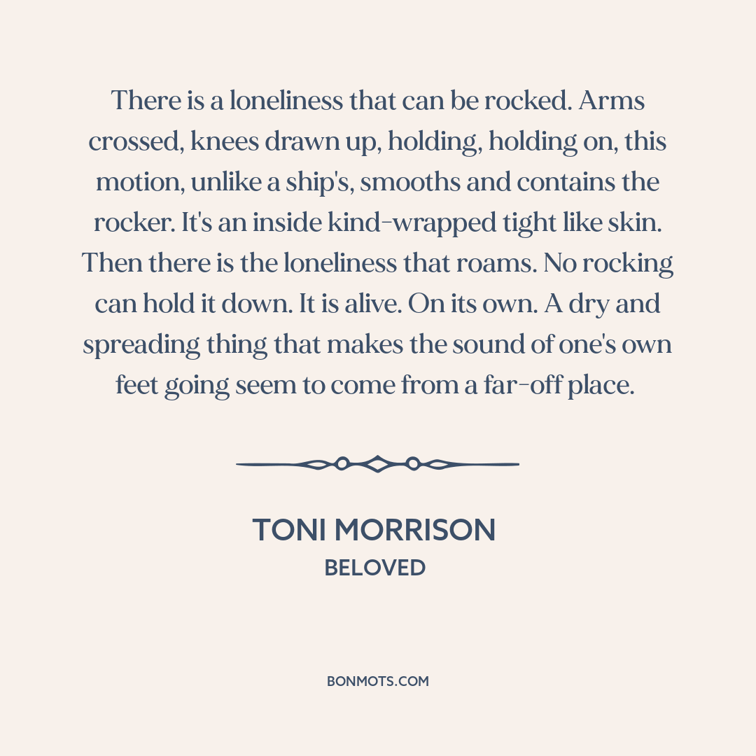 There is a loneliness that can be rocked. Arms crossed, knees drawn up, holding, holding on, this motion, unlike a ship's, smooths and contains the rocker. It's an inside kind-wrapped tight like skin. Then there is the loneliness that roams. No rocking can hold it down. It is alive. On its own. A dry and spreading thing that makes the sound of one's own feet going seem to come from a far-off place.