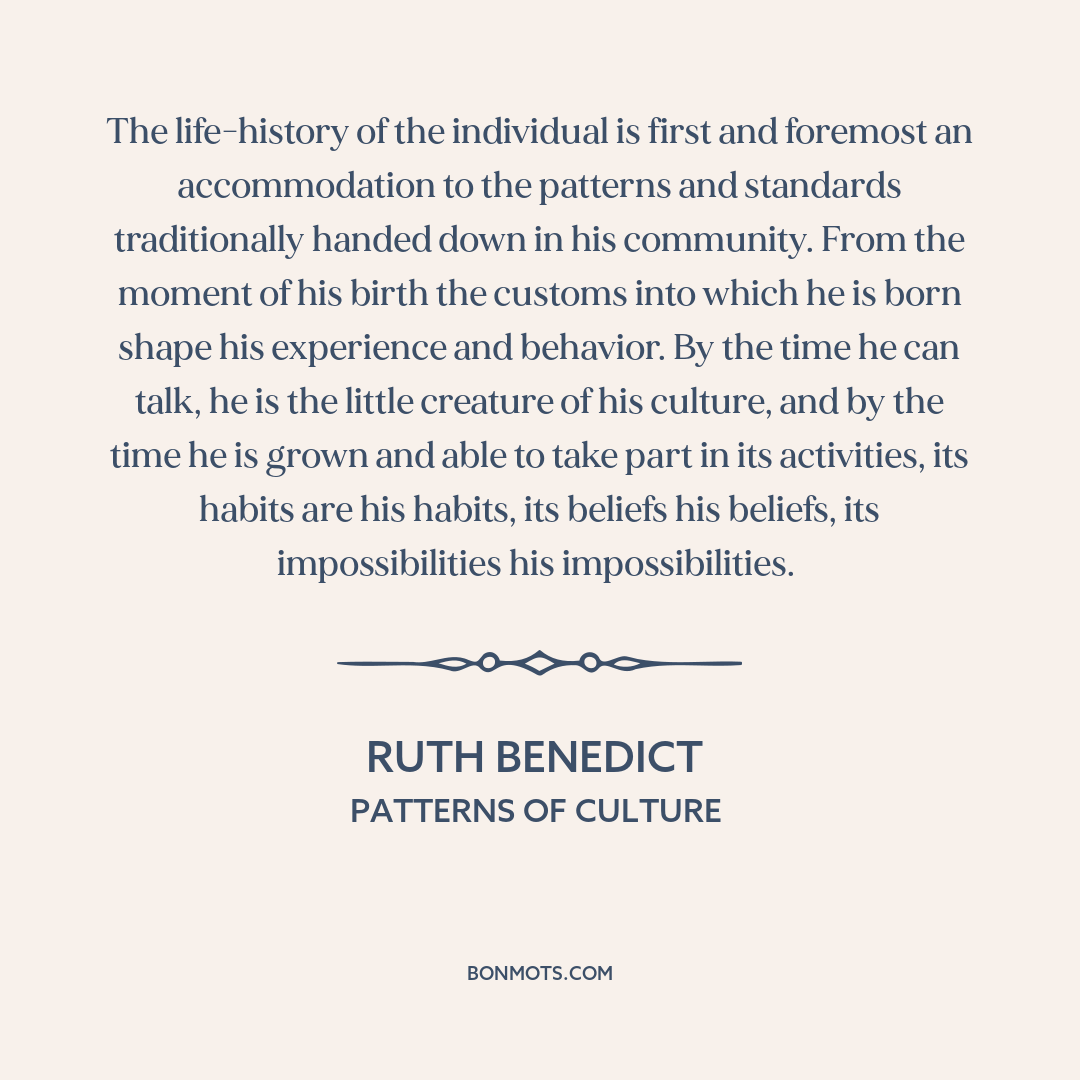 The life-history of the individual is first and foremost an accommodation to the patterns and standards traditionally handed down in his community. From the moment of his birth the customs into which he is born shape his experience and behavior. By the time he can talk, he is the little creature of his culture, and by the time he is grown and able to take part in its activities, its habits are his habits, its beliefs his beliefs, its impossibilities his impossibilities.