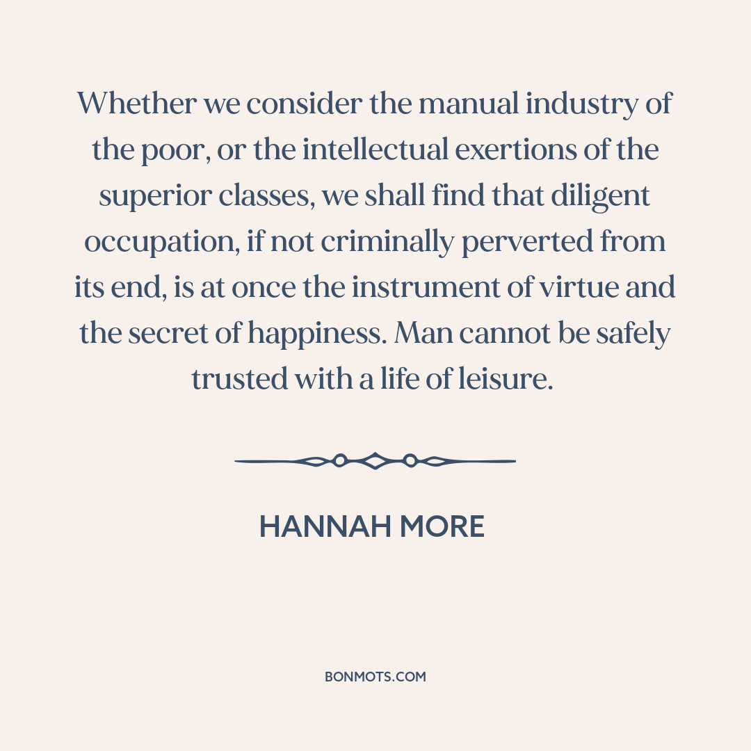 Whether we consider the manual industry of the poor, or the intellectual exertions of the superior classes, we shall find that diligent occupation, if not criminally perverted from its end, is at once the instrument of virtue and the secret of happiness. Man cannot be safely trusted with a life of leisure.