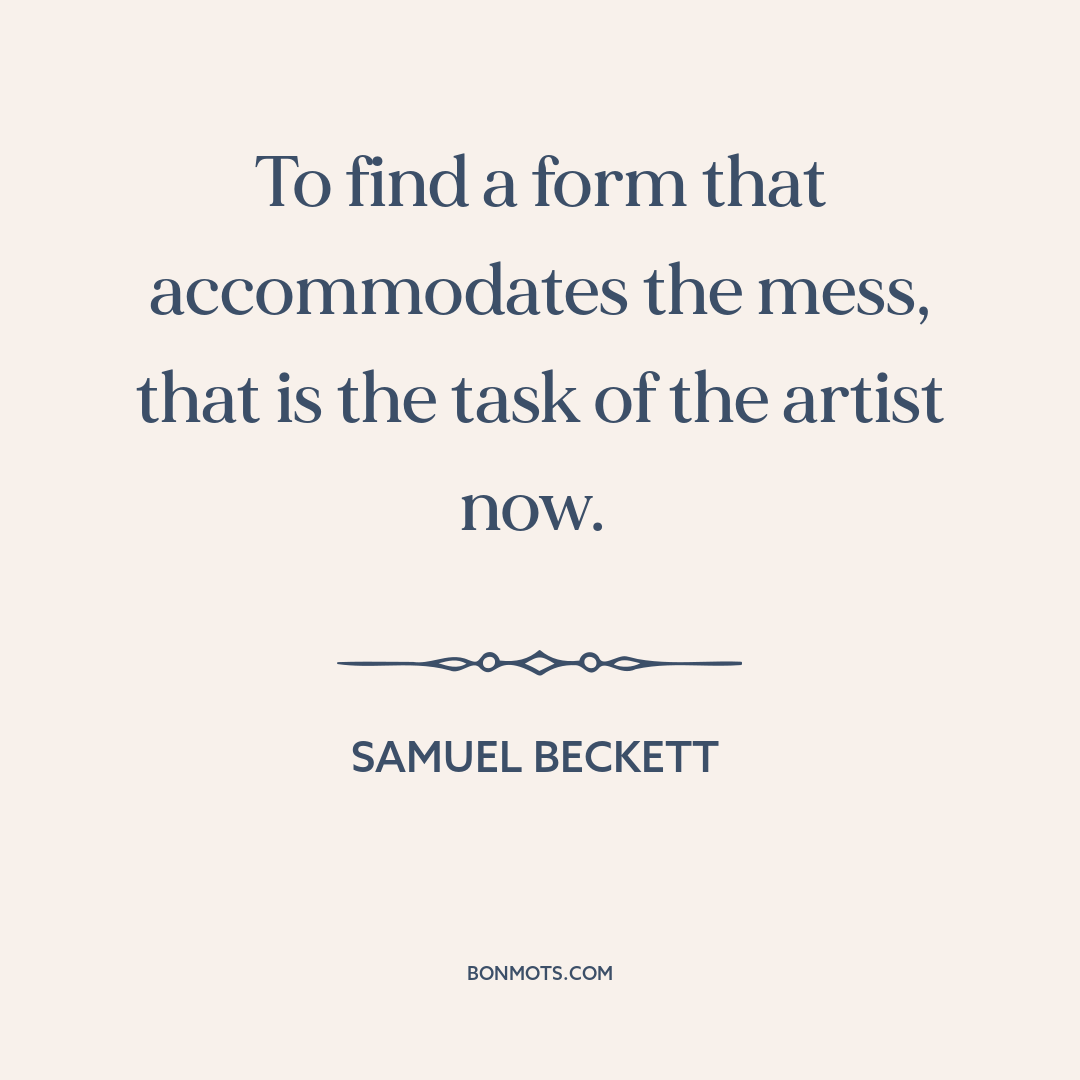 To find a form that accommodates the mess, that is the task of the artist now.