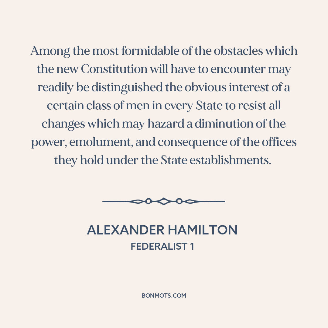 Among the most formidable of the obstacles which the new Constitution will have to encounter may readily be distinguished the obvious interest of a certain class of men in every State to resist all changes which may hazard a diminution of the power, emolument, and consequence of the offices they hold under the State establishments.