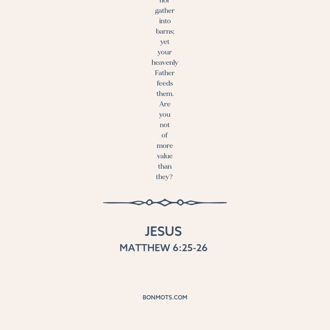 Therefore I say to you, do not worry about your life, what you will eat or what you will drink; nor about your body, what you will put on. Is not life more than food and the body more than clothing? Look at the birds of the air, for they neither sow nor reap nor gather into barns; yet your heavenly Father feeds them. Are you not of more value than they?