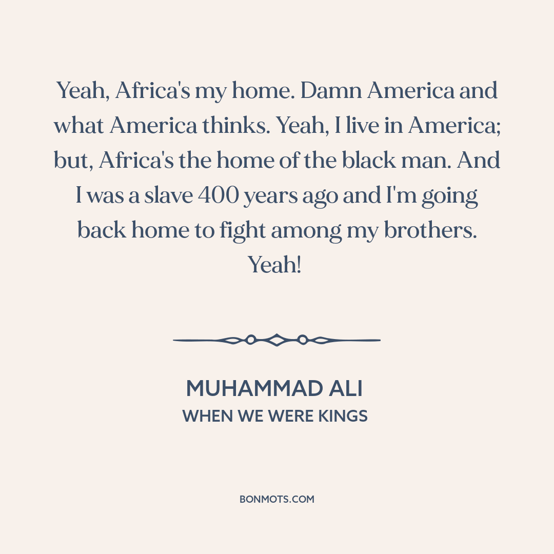 Yeah, Africa's my home. Damn America and what America thinks. Yeah, I live in America; but, Africa's the home of the black man. And I was a slave 400 years ago and I'm going back home to fight among my brothers. Yeah!