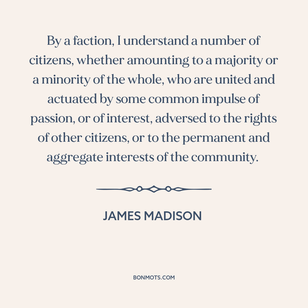 By a faction, I understand a number of citizens, whether amounting to a majority or a minority of the whole, who are united and actuated by some common impulse of passion, or of interest, adversed to the rights of other citizens, or to the permanent and aggregate interests of the community.