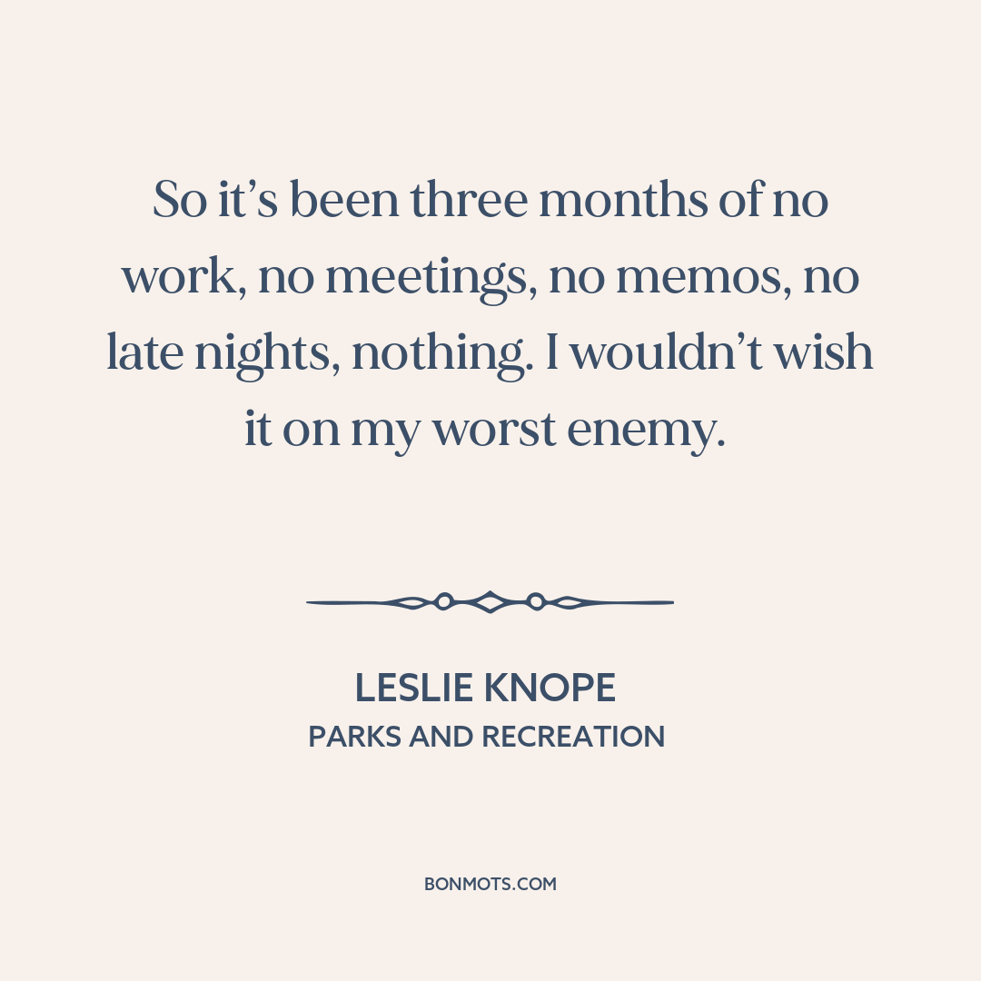 So it’s been three months of no work, no meetings, no memos, no late nights, nothing. I wouldn’t wish it on my worst enemy.