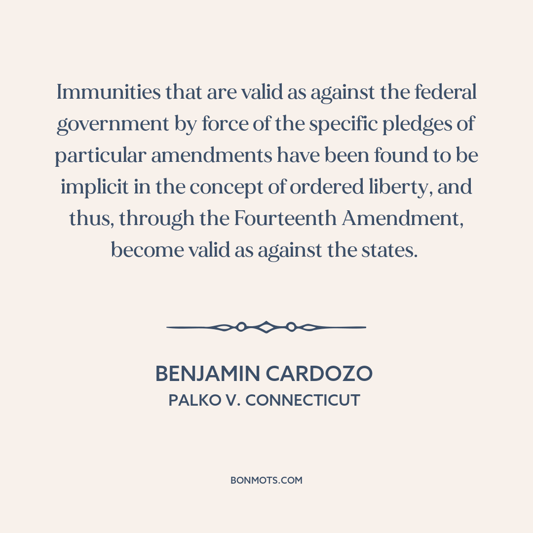 Immunities that are valid as against the federal government by force of the specific pledges of particular amendments have been found to be implicit in the concept of ordered liberty, and thus, through the Fourteenth Amendment, become valid as against the states.