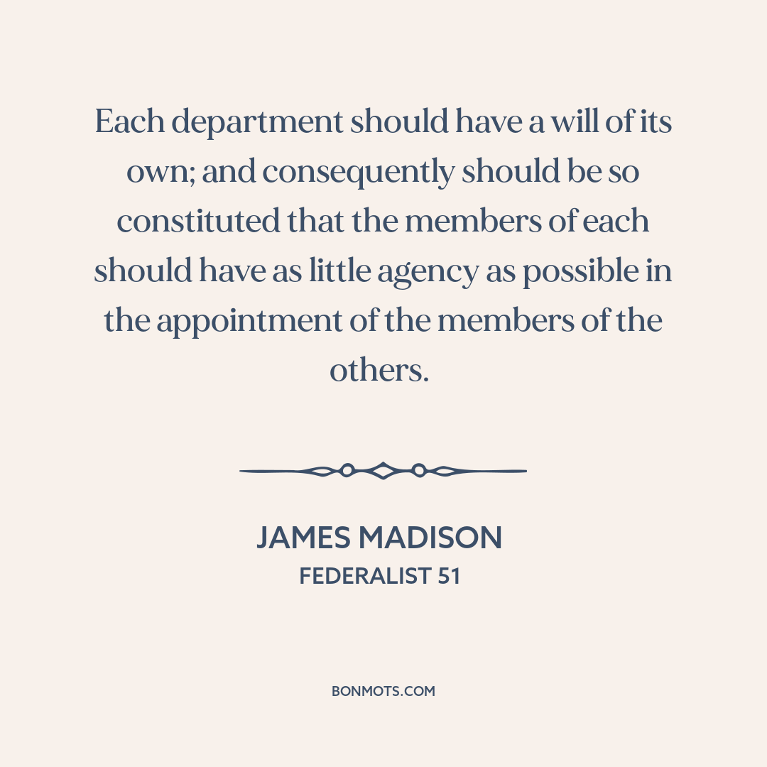 Each department should have a will of its own; and consequently should be so constituted that the members of each should have as little agency as possible in the appointment of the members of the others.