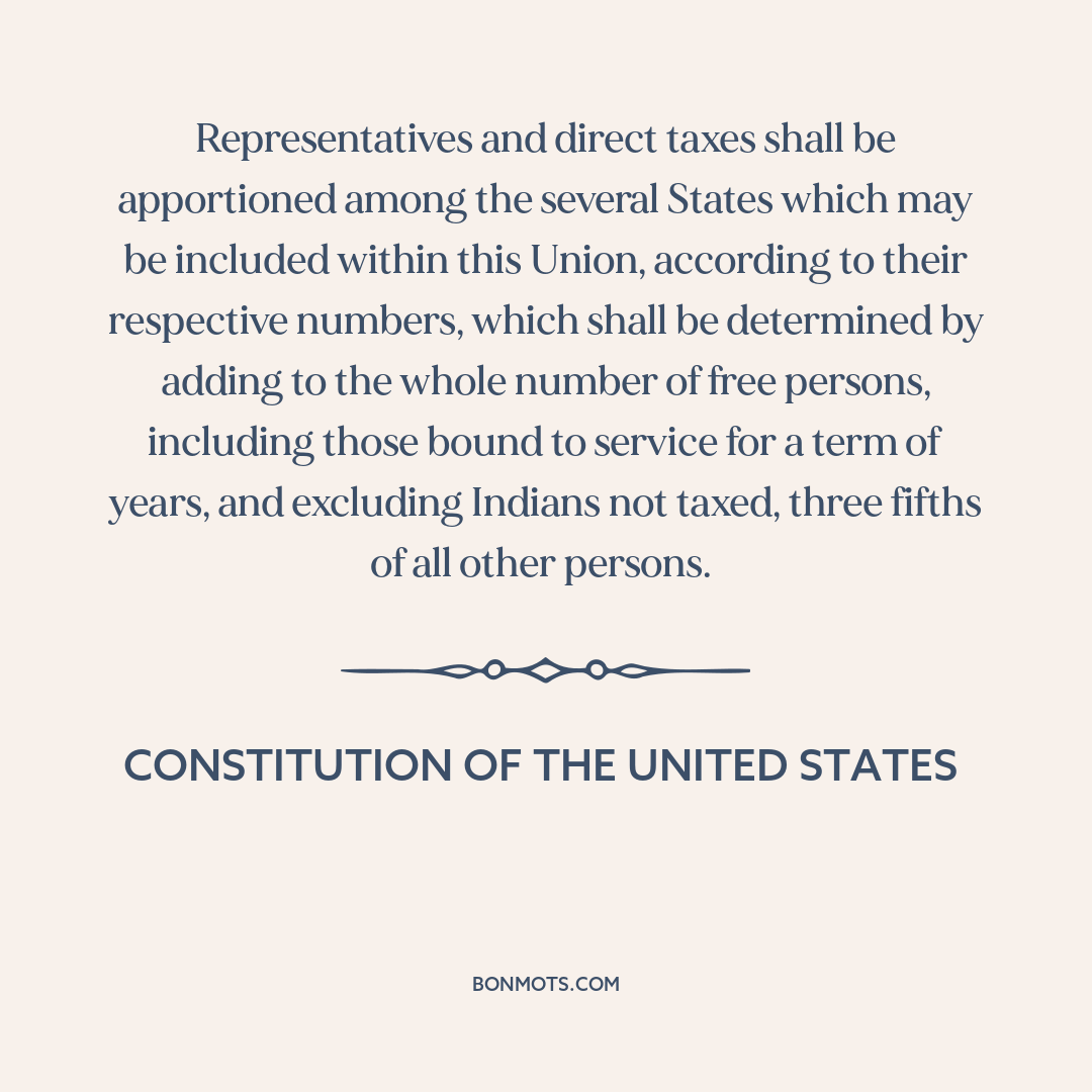 Representatives and direct taxes shall be apportioned among the several States which may be included within this Union, according to their respective numbers, which shall be determined by adding to the whole number of free persons, including those bound to service for a term of years, and excluding Indians not taxed, three fifths of all other persons.