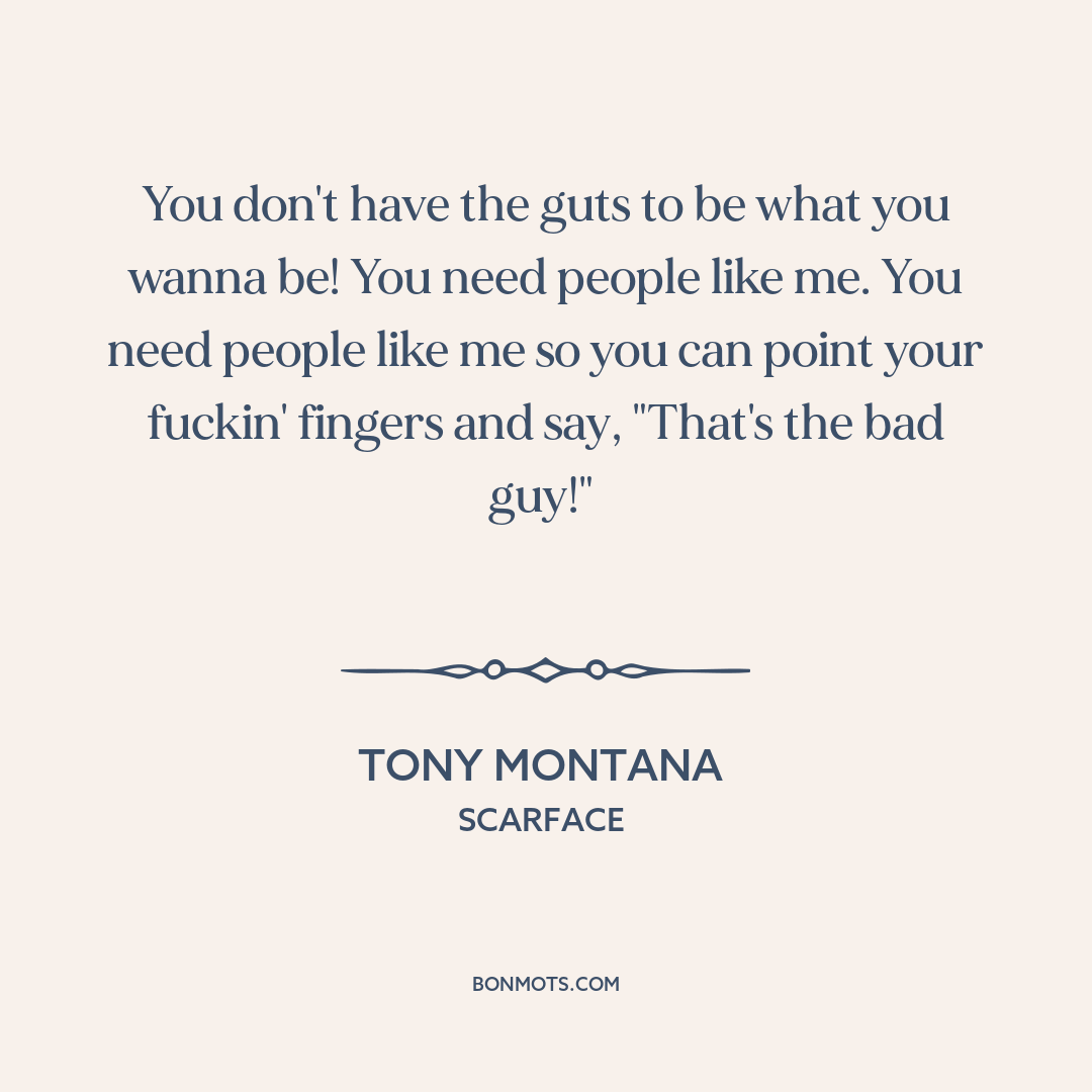 You don't have the guts to be what you wanna be! You need people like me. You need people like me so you can point your fuckin' fingers and say, "That's the bad guy!"