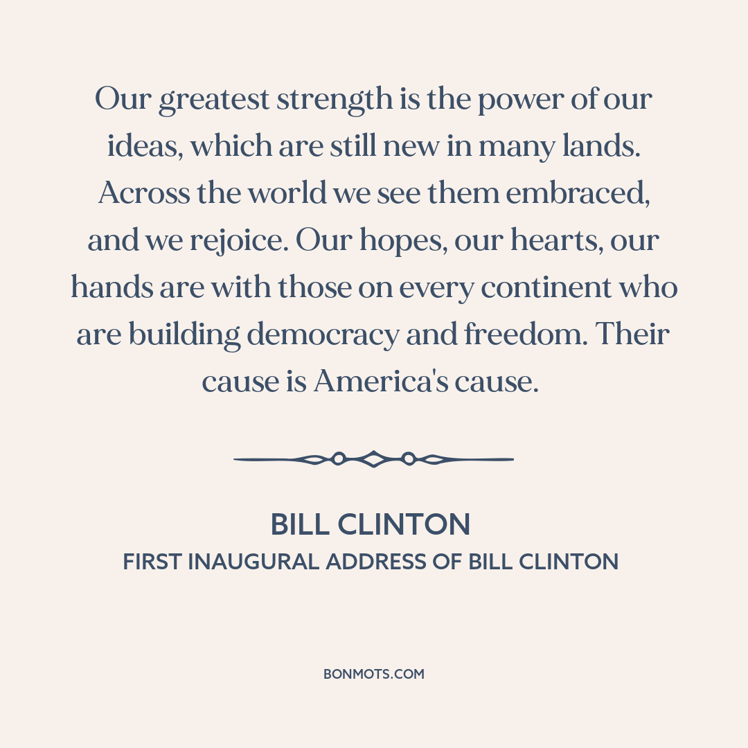 Our greatest strength is the power of our ideas, which are still new in many lands. Across the world we see them embraced, and we rejoice. Our hopes, our hearts, our hands are with those on every continent who are building democracy and freedom. Their cause is America's cause.