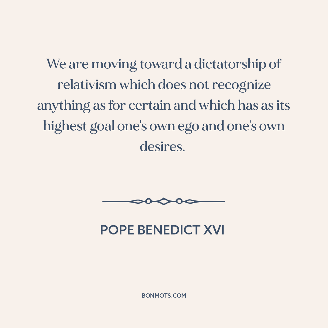 We are moving toward a dictatorship of relativism which does not recognize anything as for certain and which has as its highest goal one's own ego and one's own desires.