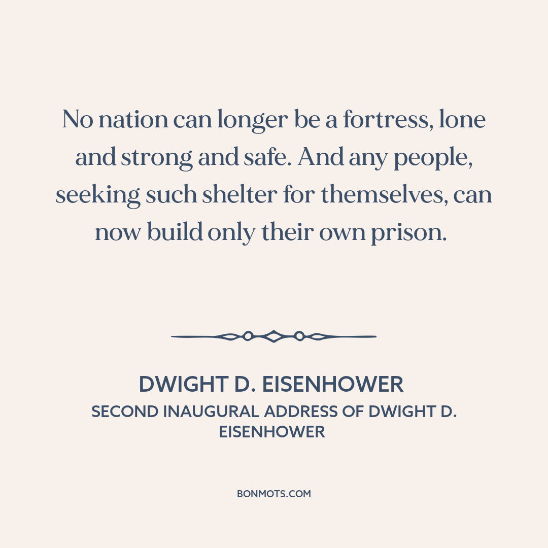 No nation can longer be a fortress, lone and strong and safe. And any people, seeking such shelter for themselves, can now build only their own prison.