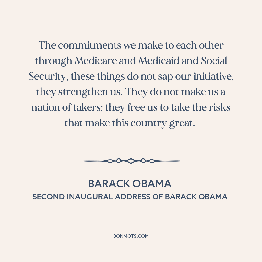 The commitments we make to each other through Medicare and Medicaid and Social Security, these things do not sap our initiative, they strengthen us. They do not make us a nation of takers; they free us to take the risks that make this country great.