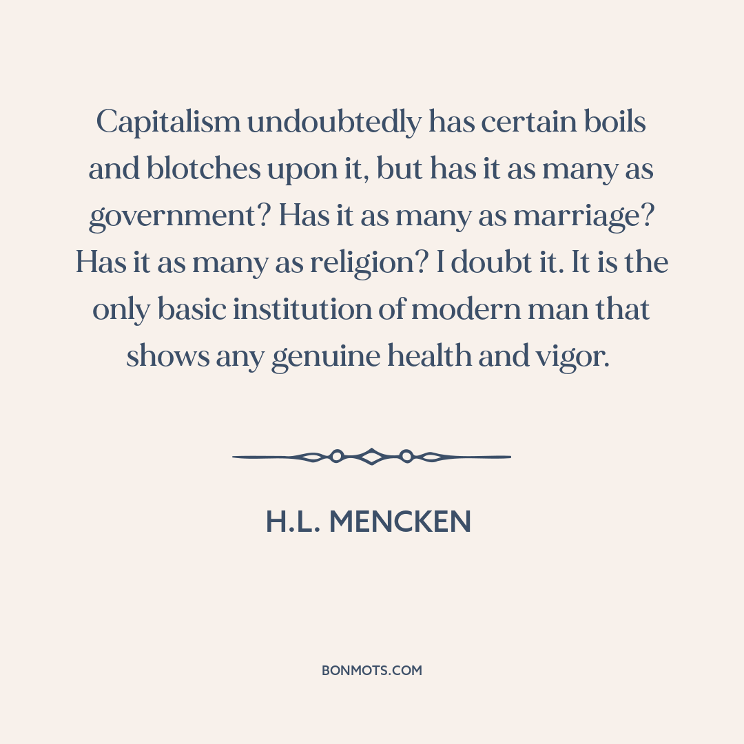 Capitalism undoubtedly has certain boils and blotches upon it, but has it as many as government? Has it as many as marriage? Has it as many as religion? I doubt it. It is the only basic institution of modern man that shows any genuine health and vigor.