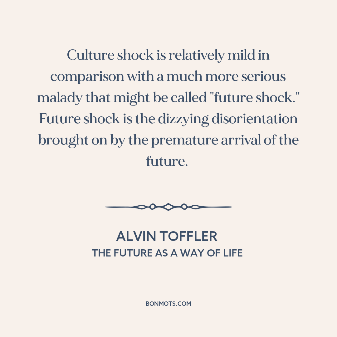 Culture shock is relatively mild in comparison with a much more serious malady that might be called "future shock." Future shock is the dizzying disorientation brought on by the premature arrival of the future.