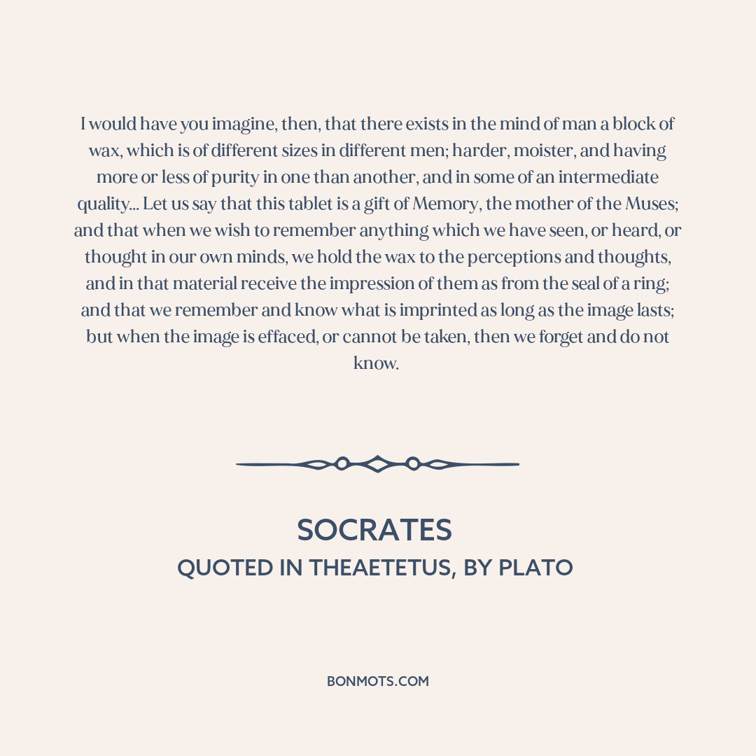 I would have you imagine, then, that there exists in the mind of man a block of wax, which is of different sizes in different men; harder, moister, and having more or less of purity in one than another, and in some of an intermediate quality... Let us say that this tablet is a gift of Memory, the mother of the Muses; and that when we wish to remember anything which we have seen, or heard, or thought in our own minds, we hold the wax to the perceptions and thoughts, and in that material receive the impression of them as from the seal of a ring; and that we remember and know what is imprinted as long as the image lasts; but when the image is effaced, or cannot be taken, then we forget and do not know.