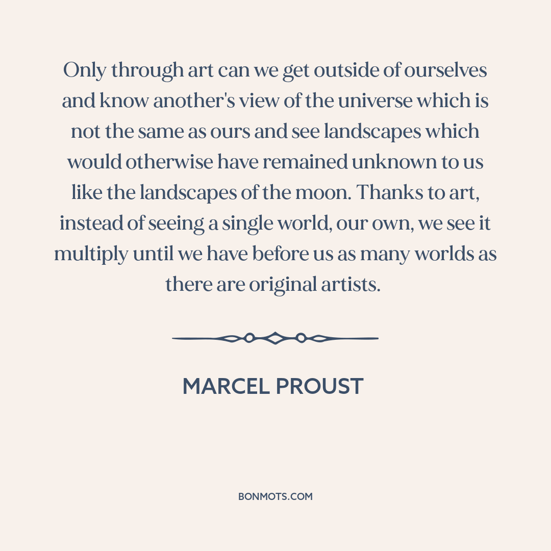 Only through art can we get outside of ourselves and know another's view of the universe which is not the same as ours and see landscapes which would otherwise have remained unknown to us like the landscapes of the moon. Thanks to art, instead of seeing a single world, our own, we see it multiply until we have before us as many worlds as there are original artists.