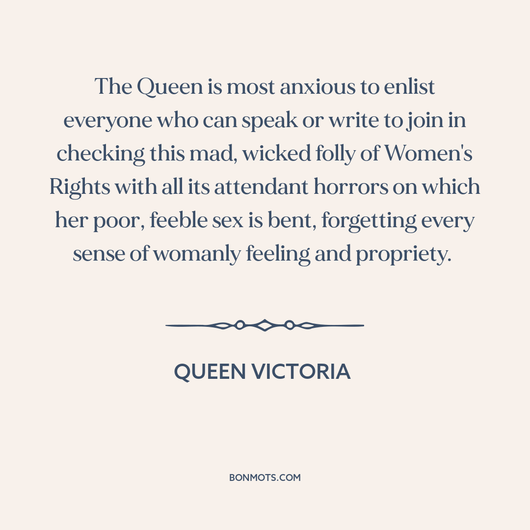 The Queen is most anxious to enlist everyone who can speak or write to join in checking this mad, wicked folly of Women's Rights with all its attendant horrors on which her poor, feeble sex is bent, forgetting every sense of womanly feeling and propriety.