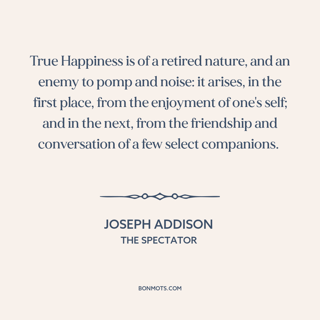 True Happiness is of a retired nature, and an enemy to pomp and noise: it arises, in the first place, from the enjoyment of one's self; and in the next, from the friendship and conversation of a few select companions.