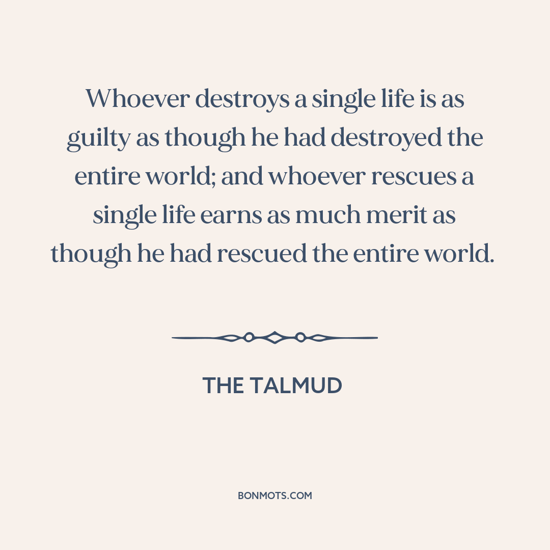 Whoever destroys a single life is as guilty as though he had destroyed the entire world; and whoever rescues a single life earns as much merit as though he had rescued the entire world.