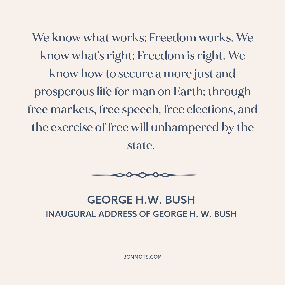 We know what works: Freedom works. We know what's right: Freedom is right. We know how to secure a more just and prosperous life for man on Earth: through free markets, free speech, free elections, and the exercise of free will unhampered by the state.