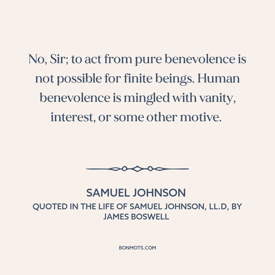 No, Sir; to act from pure benevolence is not possible for finite beings. Human benevolence is mingled with vanity, interest, or some other motive.