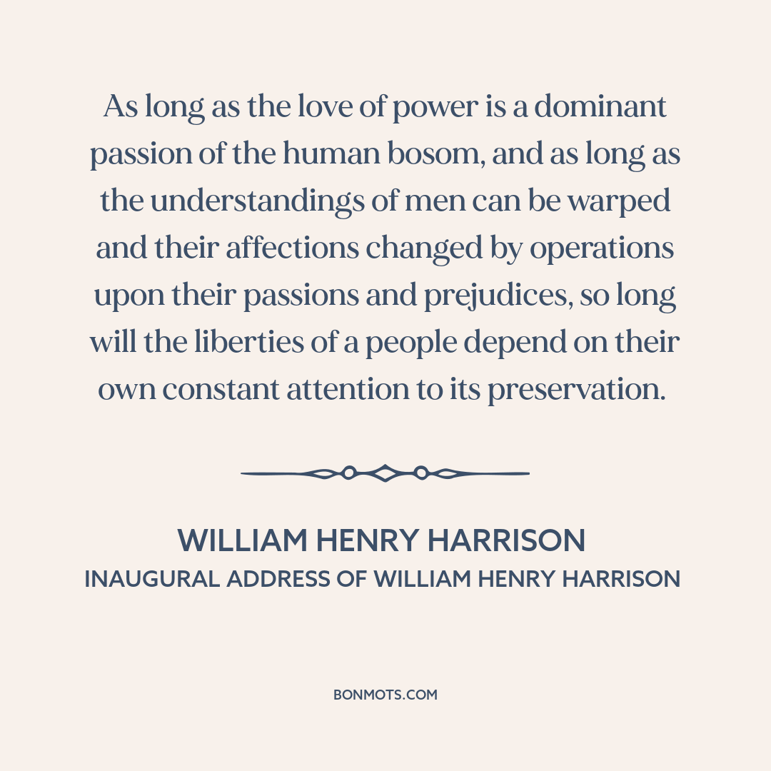 As long as the love of power is a dominant passion of the human bosom, and as long as the understandings of men can be warped and their affections changed by operations upon their passions and prejudices, so long will the liberties of a people depend on their own constant attention to its preservation.