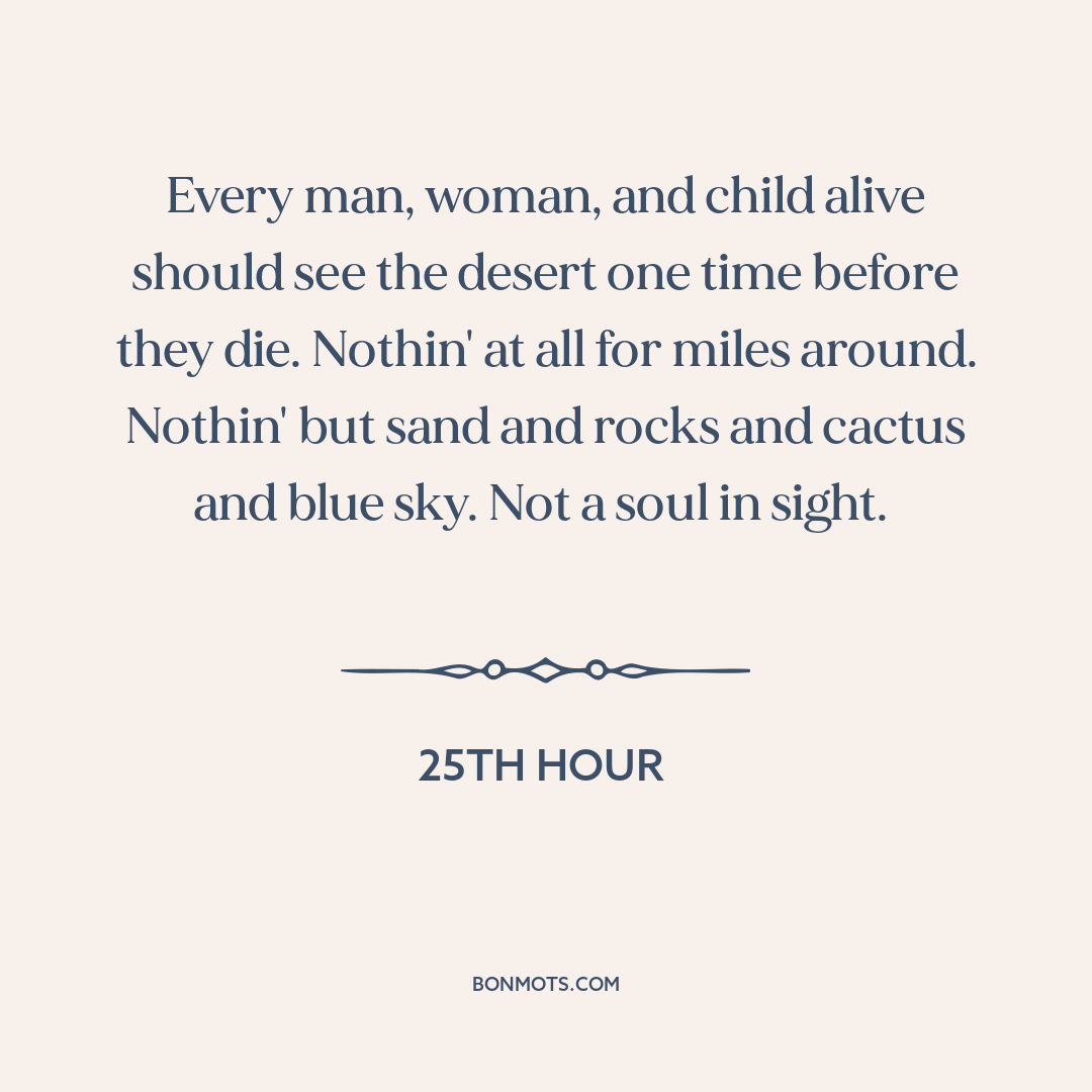 Every man, woman, and child alive should see the desert one time before they die. Nothin' at all for miles around. Nothin' but sand and rocks and cactus and blue sky. Not a soul in sight.