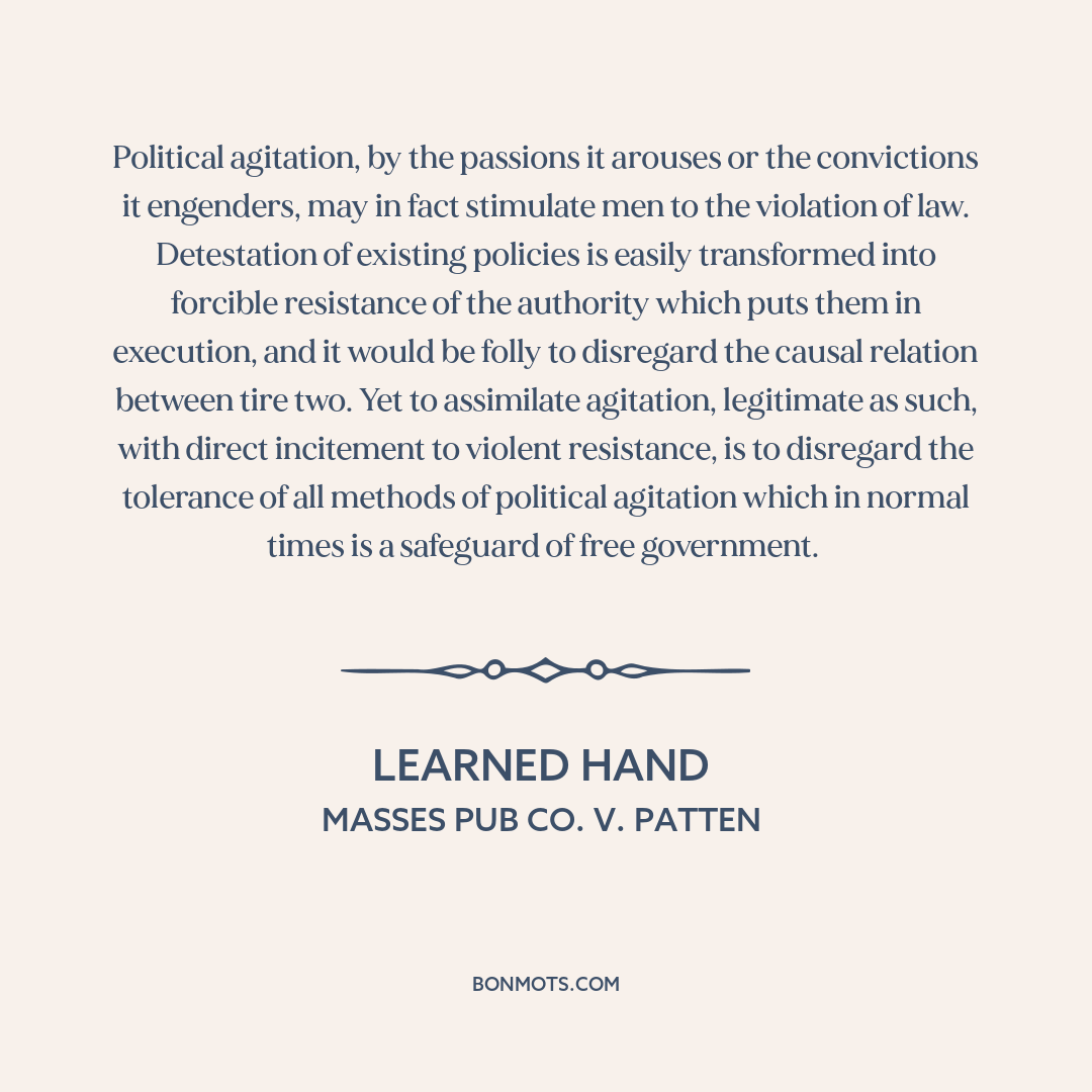 Political agitation, by the passions it arouses or the convictions it engenders, may in fact stimulate men to the violation of law. Detestation of existing policies is easily transformed into forcible resistance of the authority which puts them in execution, and it would be folly to disregard the causal relation between tire two. Yet to assimilate agitation, legitimate as such, with direct incitement to violent resistance, is to disregard the tolerance of all methods of political agitation which in normal times is a safeguard of free government.