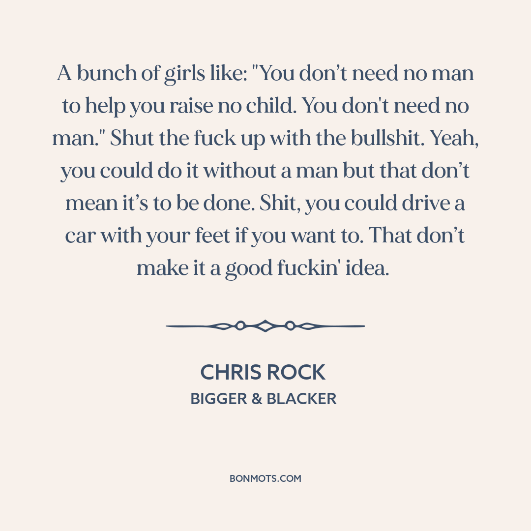A bunch of girls like: "You don’t need no man to help you raise no child. You don't need no man." Shut the fuck up with the bullshit. Yeah, you could do it without a man but that don’t mean it’s to be done. Shit, you could drive a car with your feet if you want to. That don’t make it a good fuckin' idea.