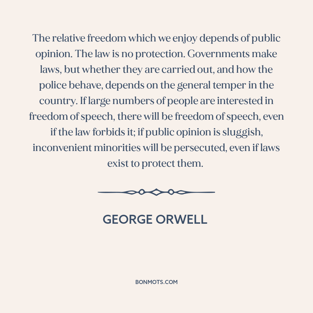 The relative freedom which we enjoy depends of public opinion. The law is no protection. Governments make laws, but whether they are carried out, and how the police behave, depends on the general temper in the country. If large numbers of people are interested in freedom of speech, there will be freedom of speech, even if the law forbids it; if public opinion is sluggish, inconvenient minorities will be persecuted, even if laws exist to protect them.