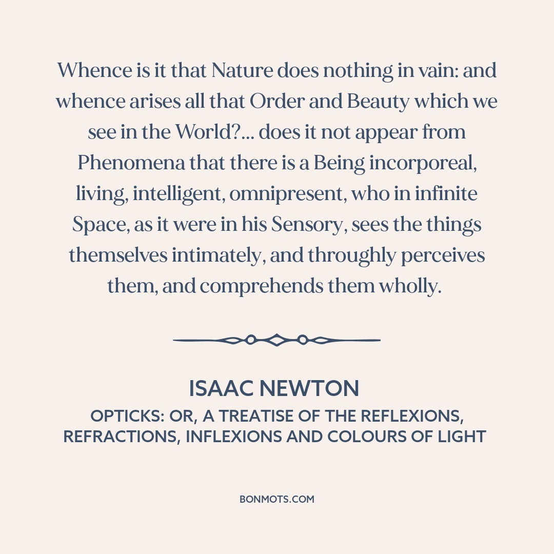 Whence is it that Nature does nothing in vain: and whence arises all that Order and Beauty which we see in the World?... does it not appear from Phenomena that there is a Being incorporeal, living, intelligent, omnipresent, who in infinite Space, as it were in his Sensory, sees the things themselves intimately, and throughly perceives them, and comprehends them wholly.