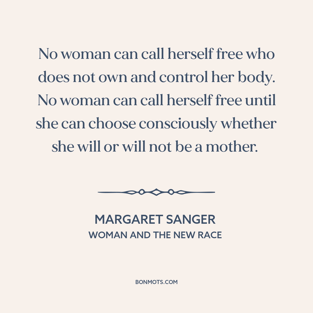 No woman can call herself free who does not own and control her body. No woman can call herself free until she can choose consciously whether she will or will not be a mother.