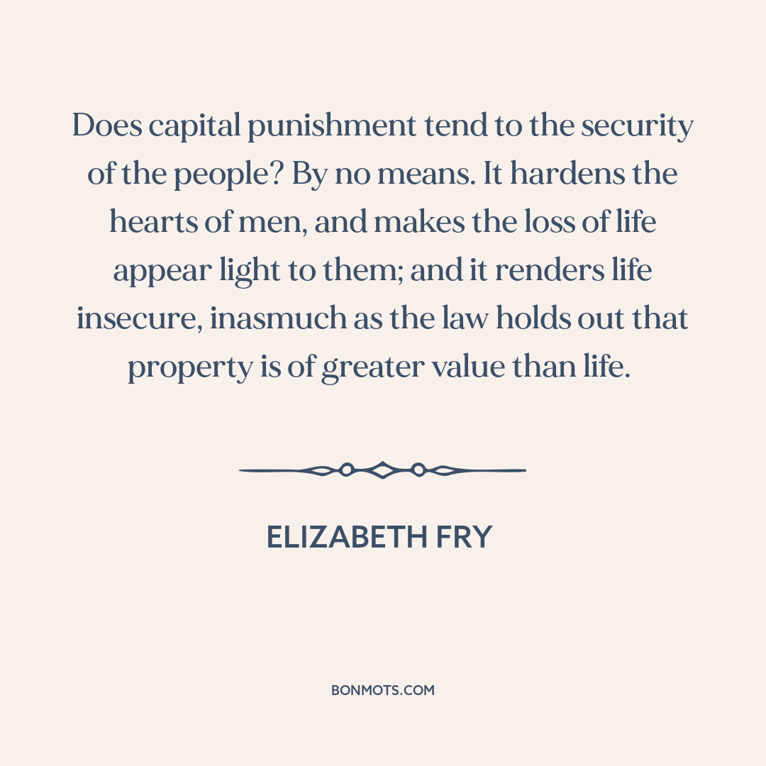 Does capital punishment tend to the security of the people? By no means. It hardens the hearts of men, and makes the loss of life appear light to them; and it renders life insecure, inasmuch as the law holds out that property is of greater value than life.