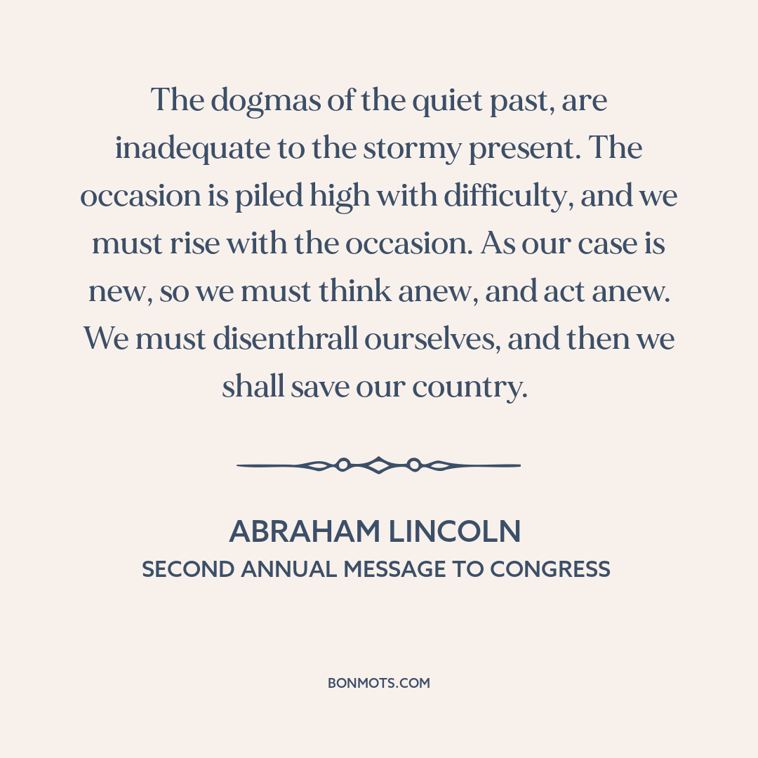 The dogmas of the quiet past, are inadequate to the stormy present. The occasion is piled high with difficulty, and we must rise with the occasion. As our case is new, so we must think anew, and act anew. We must disenthrall ourselves, and then we shall save our country.