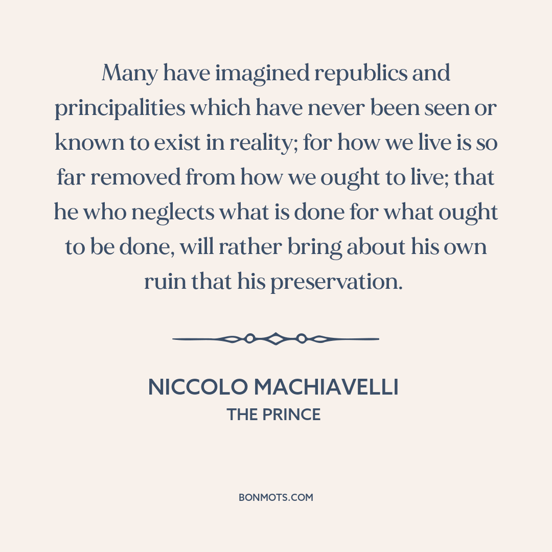 Many have imagined republics and principalities which have never been seen or known to exist in reality; for how we live is so far removed from how we ought to live; that he who neglects what is done for what ought to be done, will rather bring about his own ruin that his preservation.