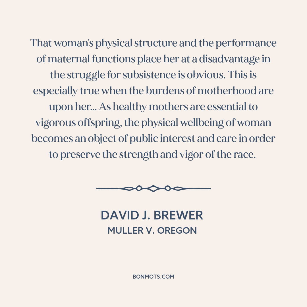 That woman's physical structure and the performance of maternal functions place her at a disadvantage in the struggle for subsistence is obvious. This is especially true when the burdens of motherhood are upon her... As healthy mothers are essential to vigorous offspring, the physical wellbeing of woman becomes an object of public interest and care in order to preserve the strength and vigor of the race.