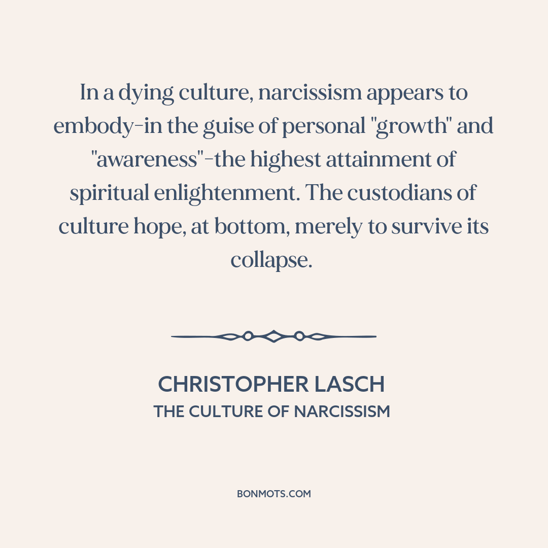 In a dying culture, narcissism appears to embody-in the guise of personal "growth" and "awareness"-the highest attainment of spiritual enlightenment. The custodians of culture hope, at bottom, merely to survive its collapse.