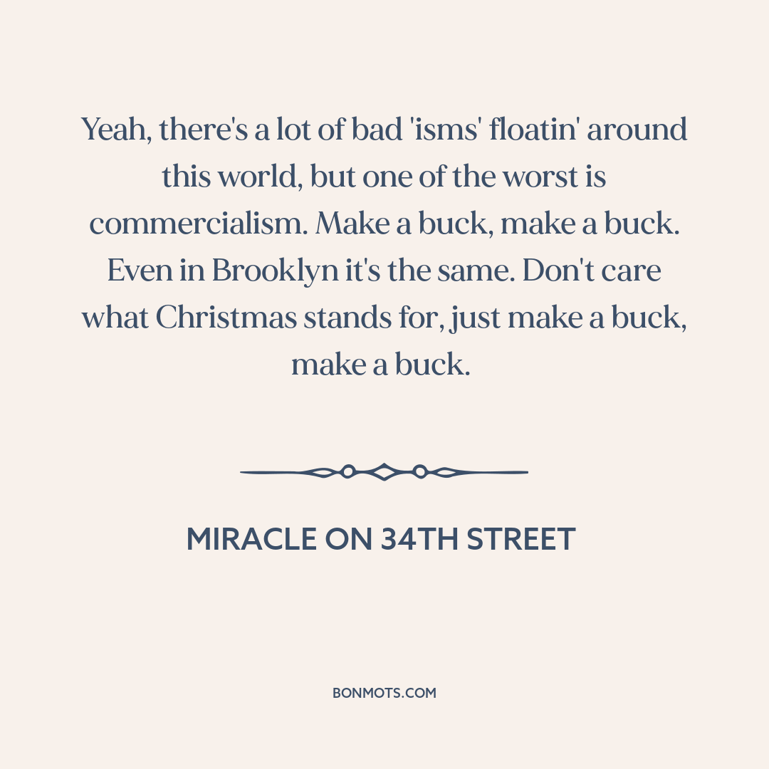 Yeah, there's a lot of bad 'isms' floatin' around this world, but one of the worst is commercialism. Make a buck, make a buck. Even in Brooklyn it's the same. Don't care what Christmas stands for, just make a buck, make a buck.