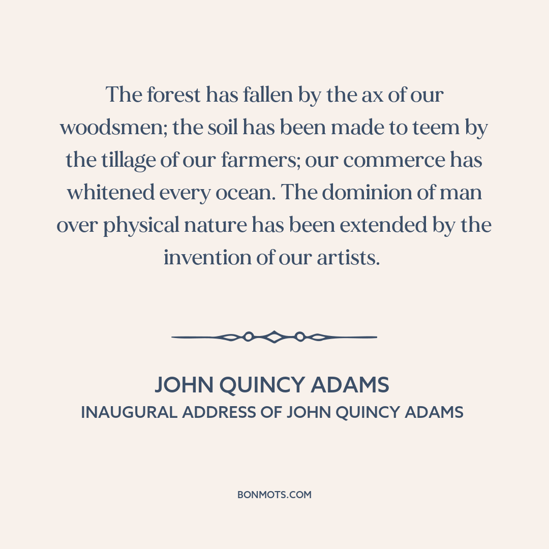 The forest has fallen by the ax of our woodsmen; the soil has been made to teem by the tillage of our farmers; our commerce has whitened every ocean. The dominion of man over physical nature has been extended by the invention of our artists.