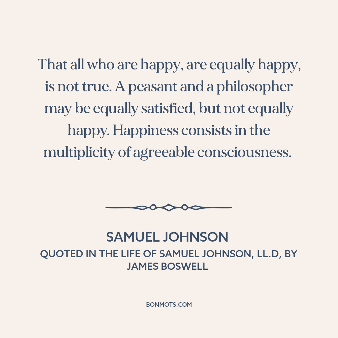 That all who are happy, are equally happy, is not true. A peasant and a philosopher may be equally satisfied, but not equally happy. Happiness consists in the multiplicity of agreeable consciousness.