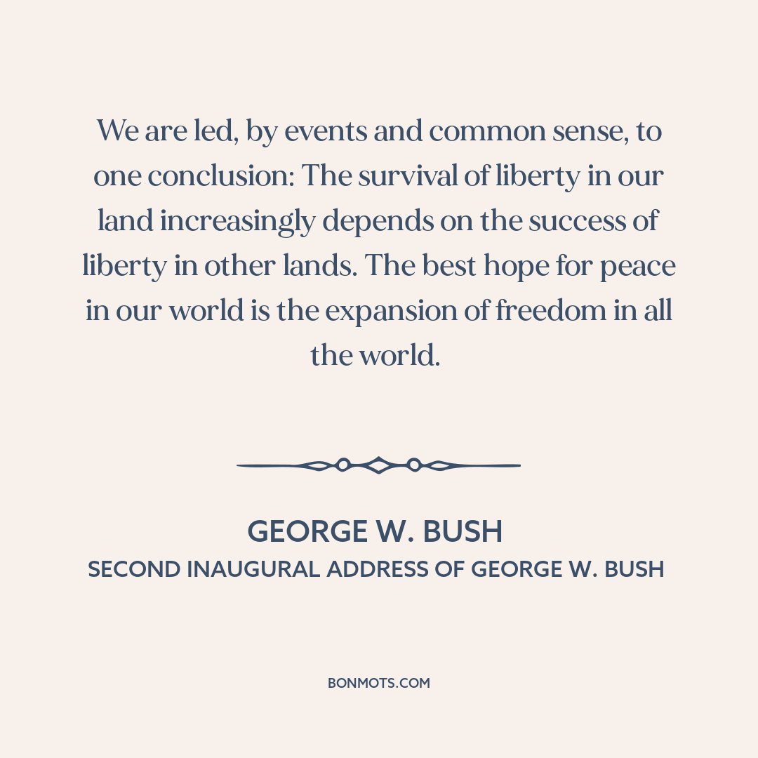 We are led, by events and common sense, to one conclusion: The survival of liberty in our land increasingly depends on the success of liberty in other lands. The best hope for peace in our world is the expansion of freedom in all the world.