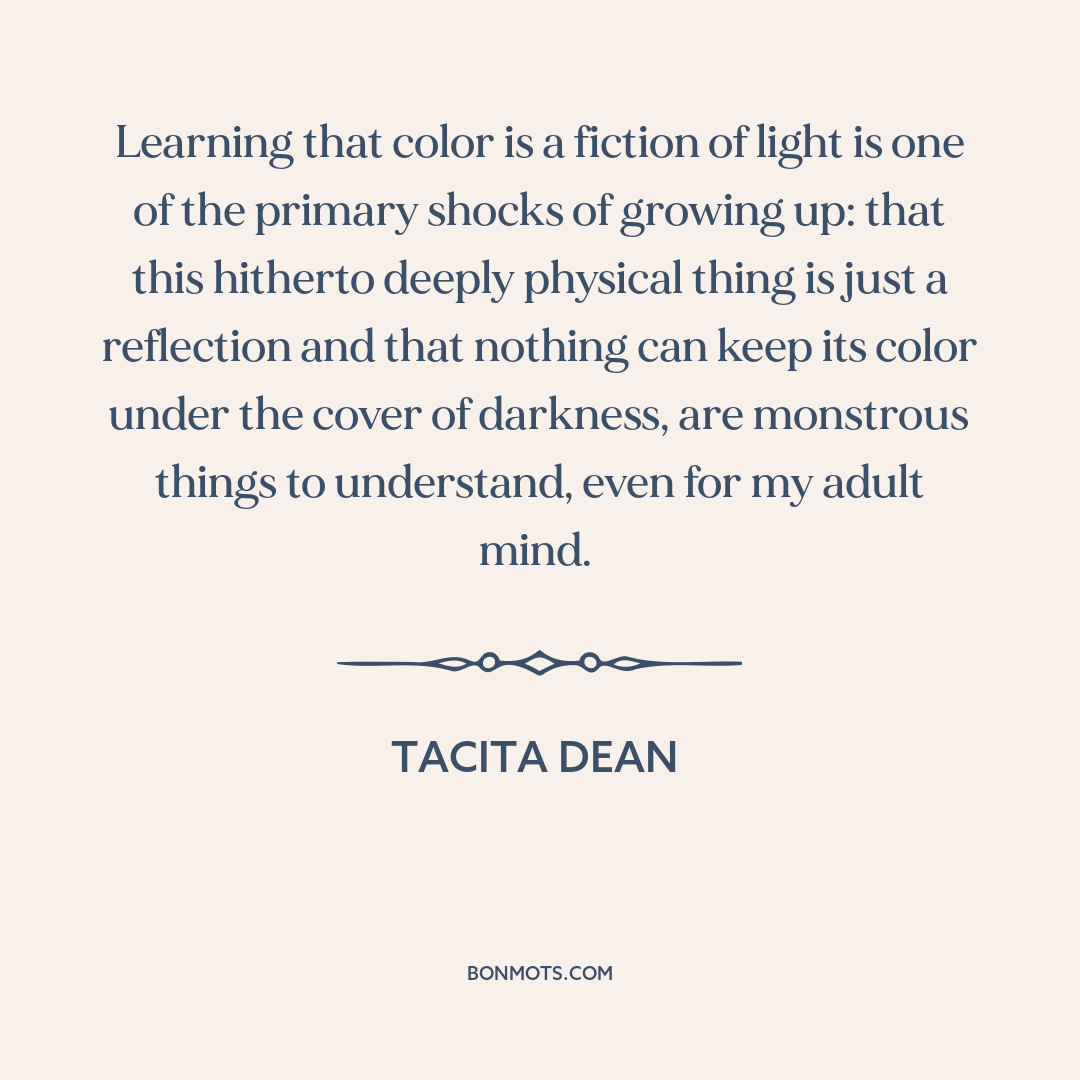 Learning that color is a fiction of light is one of the primary shocks of growing up: that this hitherto deeply physical thing is just a reflection and that nothing can keep its color under the cover of darkness, are monstrous things to understand, even for my adult mind.