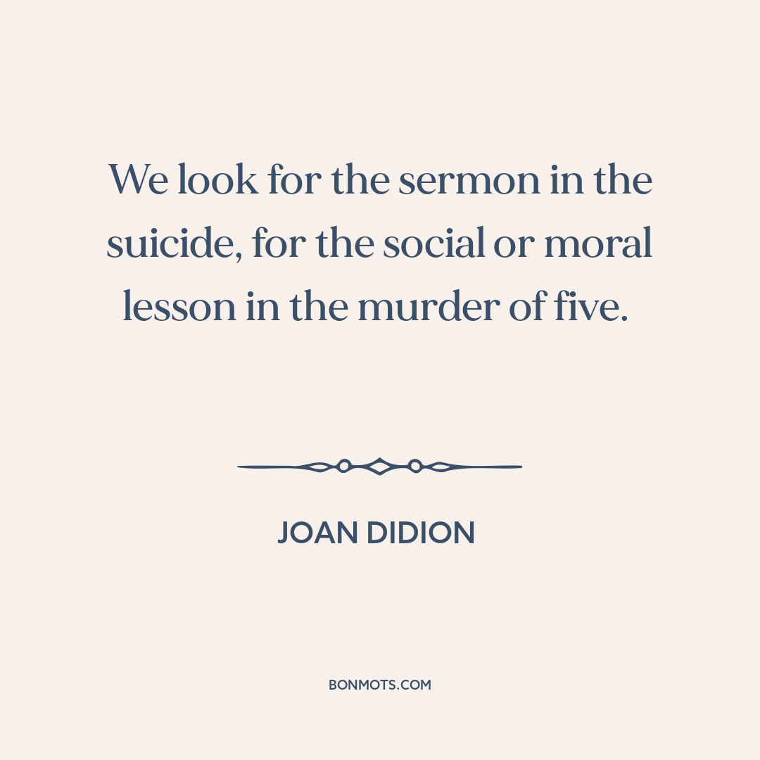 We look for the sermon in the suicide, for the social or moral lesson in the murder of five.