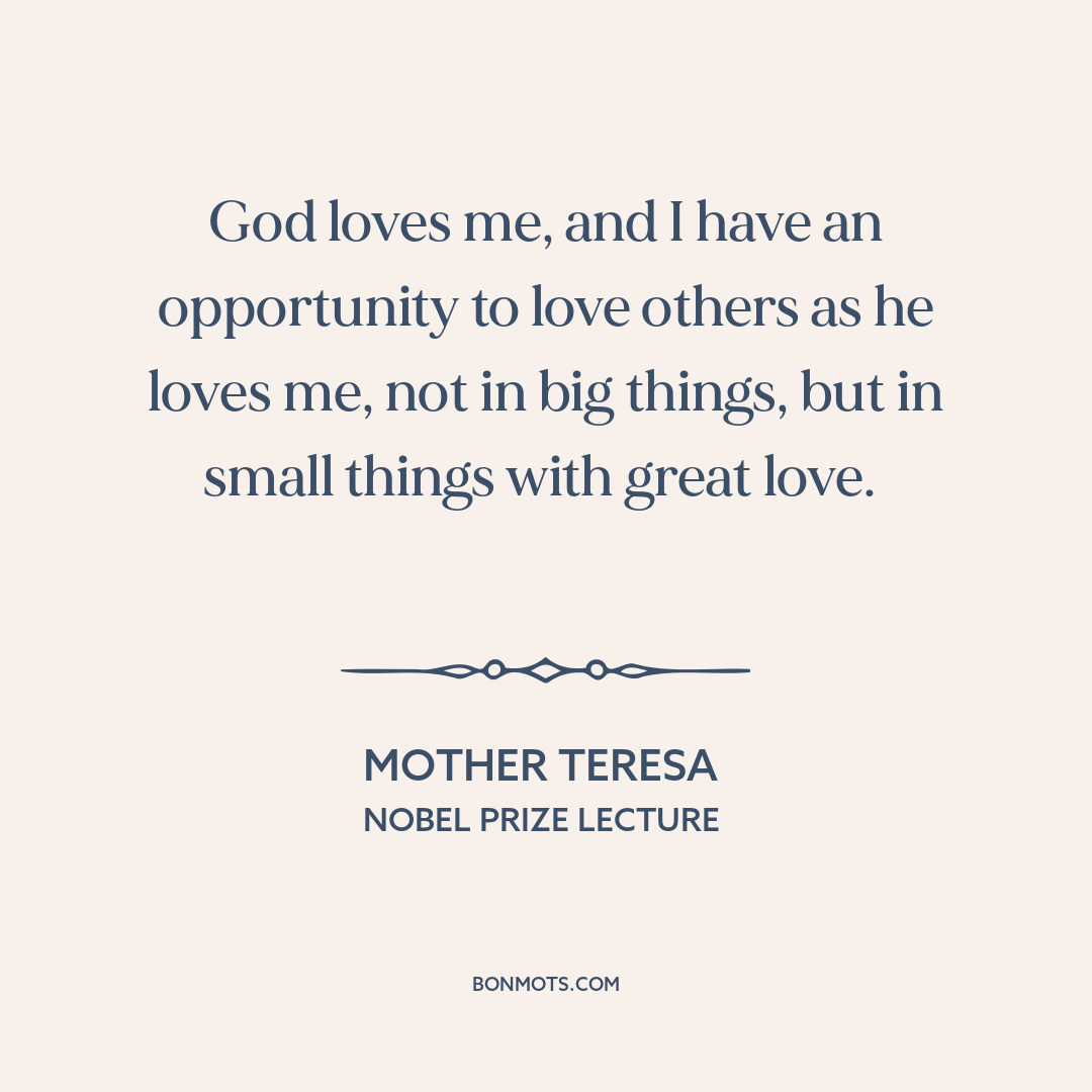 God loves me, and I have an opportunity to love others as he loves me, not in big things, but in small things with great love.