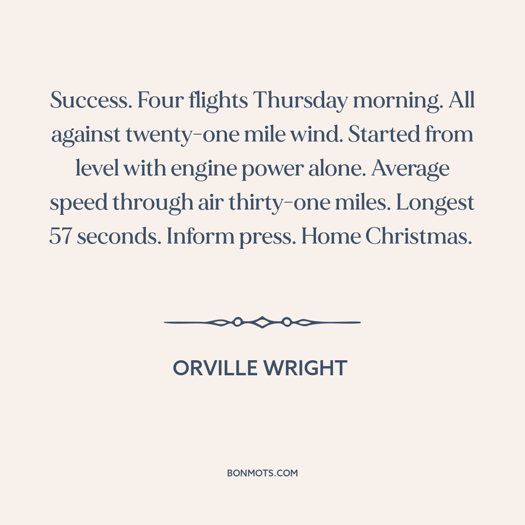 Success. Four flights Thursday morning. All against twenty-one mile wind. Started from level with engine power alone. Average speed through air thirty-one miles. Longest 57 seconds. Inform press. Home Christmas.