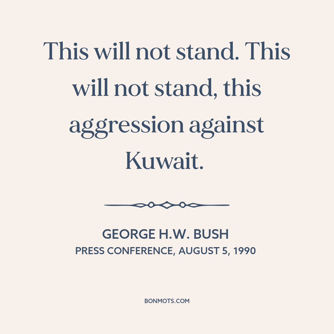 Bush, George H. W. Remark during news conference about the Iraqi invasion of Kuwait. 5 Aug. 1990, South Lawn of the White House, Washington, DC, USA.