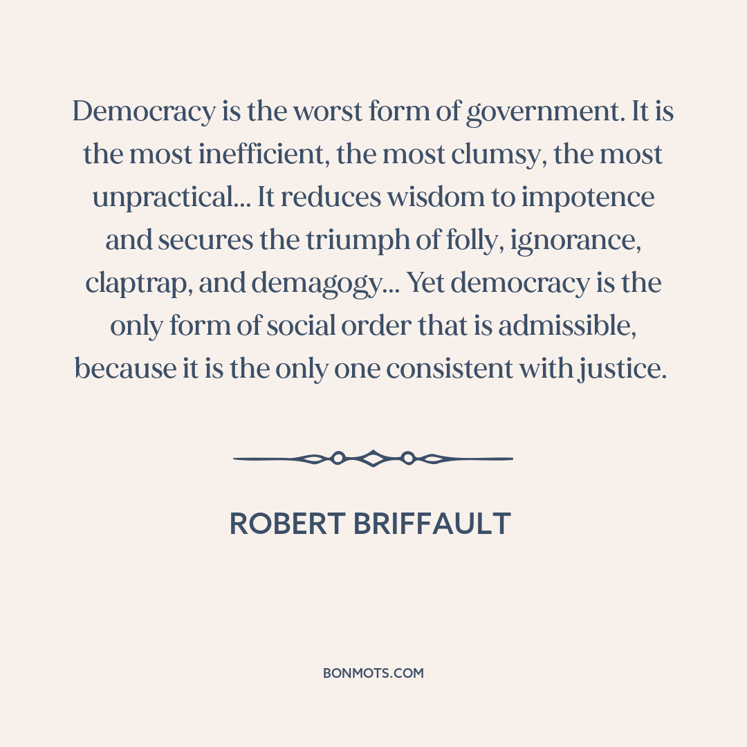 Democracy is the worst form of government. It is the most inefficient, the most clumsy, the most unpractical... It reduces wisdom to impotence and secures the triumph of folly, ignorance, claptrap, and demagogy... Yet democracy is the only form of social order that is admissible, because it is the only one consistent with justice.