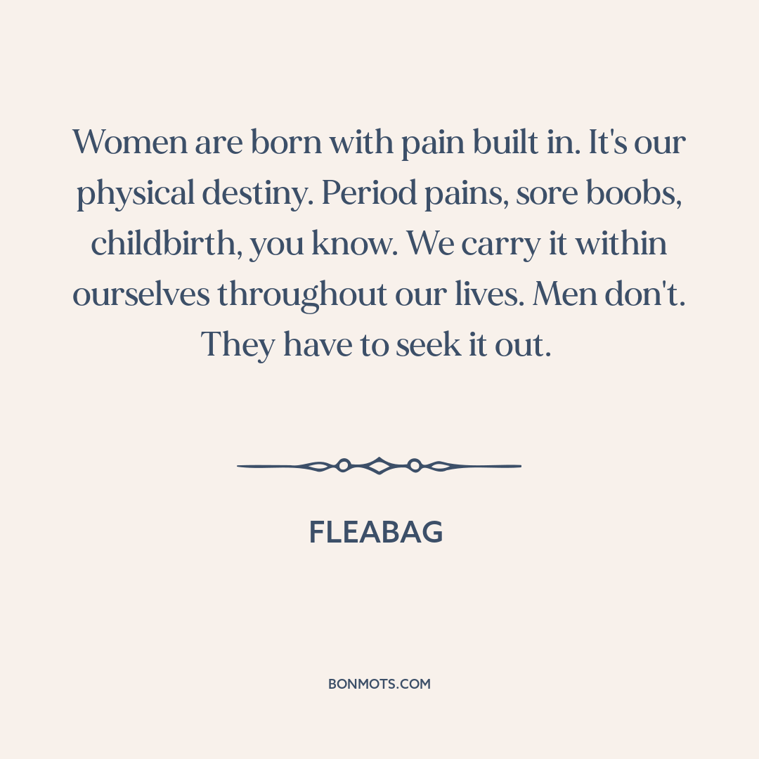 Women are born with pain built in. It's our physical destiny. Period pains, sore boobs, childbirth, you know. We carry it within ourselves throughout our lives. Men don't. They have to seek it out.